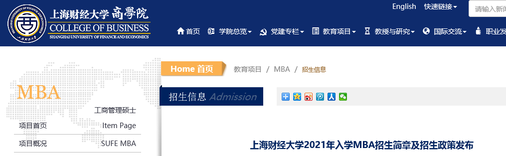 導(dǎo)讀:社科賽斯MBA網(wǎng)小編整理了“2021MBA招生簡章|2021年上海財經(jīng)大學(xué)MBA招生簡章”的相關(guān)內(nèi)容!有相關(guān)報考意愿的同學(xué)一定要及時關(guān)注!