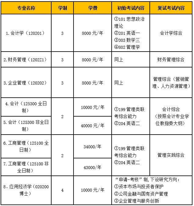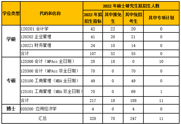 2022年商學(xué)院各學(xué)科擬招生計(jì)劃如下表。我院計(jì)劃招生人數(shù)為328人,其中學(xué)碩會計(jì)學(xué)42人、財(cái)務(wù)管理24人、企業(yè)管理41人;專碩會計(jì)(全日制)28人、會計(jì)(非全日制)70人、工商管理(全日制)49人、工商管理(非全日制)70人;應(yīng)用經(jīng)濟(jì)學(xué)博士研究生4人。