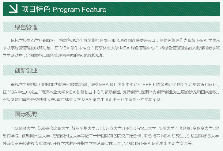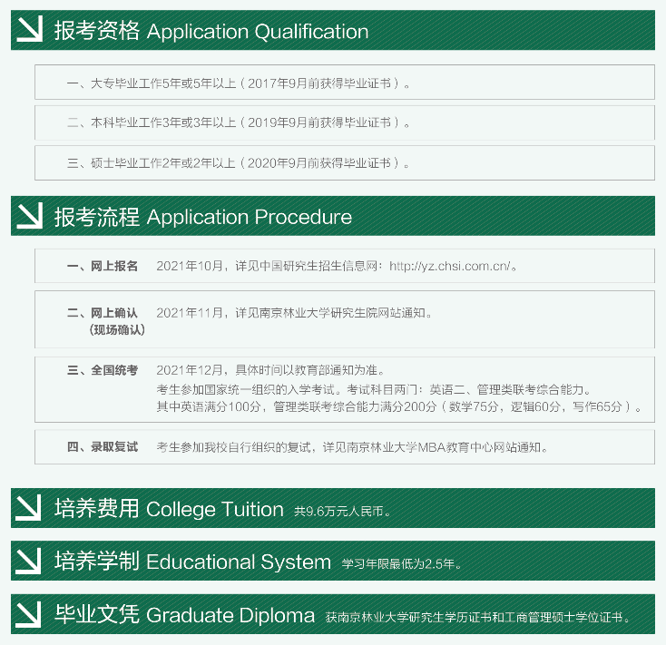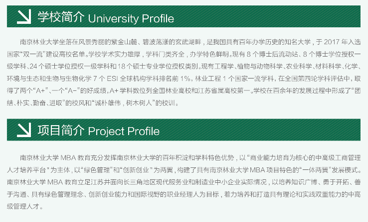 導(dǎo)讀:招生簡(jiǎn)章是每年考研er需要關(guān)注的重要官方政策,一般情況下涵蓋了各個(gè)專(zhuān)業(yè)的報(bào)考條件、招生名額、學(xué)費(fèi)、學(xué)制、報(bào)考流程等必要信息,為了幫助大家及時(shí)掌握一手信息,迅速做出報(bào)考應(yīng)對(duì),小編今天為大家?guī)?lái)了“2022MBA招生簡(jiǎn)章:南京林業(yè)大學(xué)2022年工商管理碩士(MBA)招生簡(jiǎn)章”,希望對(duì)報(bào)考MBA的同學(xué)有所幫助!