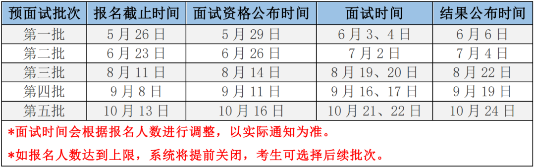 4、因面試內(nèi)容和面試群體不同,在2024年復(fù)試錄取環(huán)節(jié),預(yù)面試通過的考生仍需參加綜合素質(zhì)和專業(yè)素質(zhì)面試。同等條件下,將優(yōu)先錄取獲得預(yù)面試通過資格的考生;