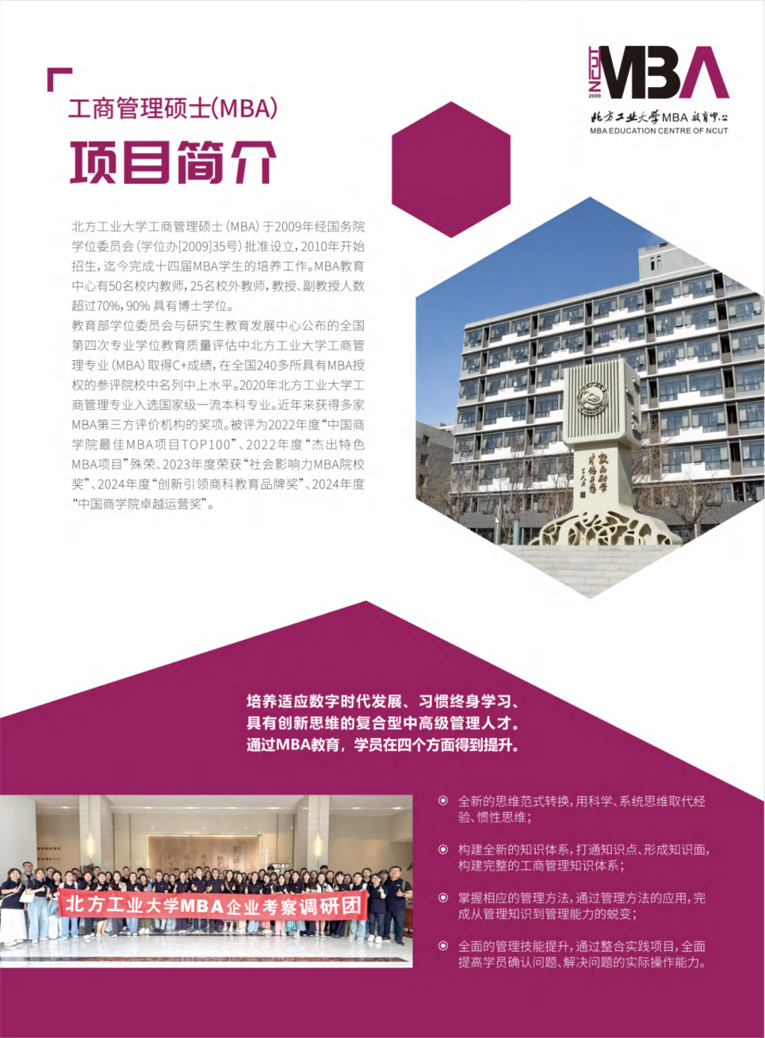 導(dǎo)讀:項(xiàng)目簡(jiǎn)介北方工業(yè)大學(xué)工商管理碩士(MBA)于2009年經(jīng)國(guó)務(wù)院學(xué)位委員會(huì)(學(xué)位辦[2009]35號(hào))批準(zhǔn)設(shè)立,2010年開(kāi)始招生,迄今完成十四屆MBA學(xué)生的